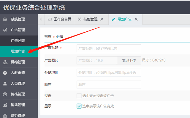 3、市级权限可以在广告管理中增加广告,无需总部审核直接上线【图片比例尺寸见后台——有提示】;